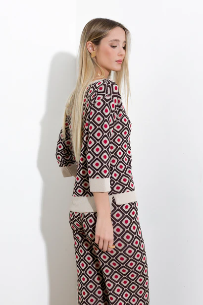 Boxy sweater in a viscose blend with a light lurex thread. It features an optical design, 3/4 sleeves, slits at the bottom, and a slightly longer back.