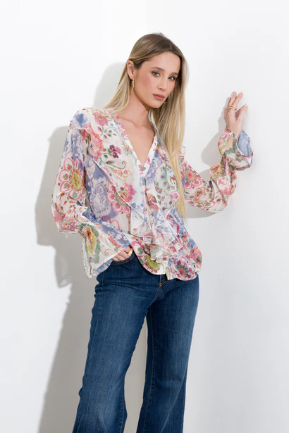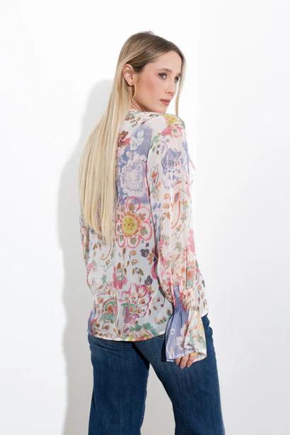 Elegant shirt with a refined cashmere print and sophisticated details. The V-neckline enhances the silhouette, while the long sleeves feature delicate smocking at the bottom and a flounce cuff for a touch of elegance. The front is embellished with ruffles that add movement and personality to the garment. Practical button closure.