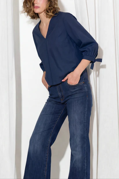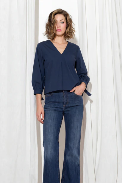 Elegant cotton blouse with a V-neck that accentuates the décolleté. The three-quarter sleeves feature delicate gathering at the cuffs, embellished with a refined bow detail. The boxy fit creates a modern and comfortable silhouette, perfect for creating sophisticated looks both in the office and on the go.