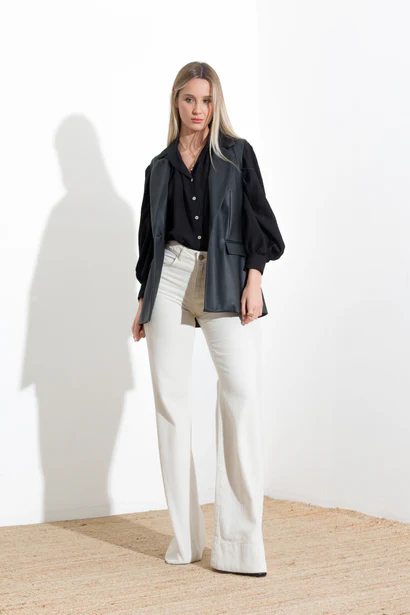 Sleeveless faux leather jacket with flap pockets and a button closure. Peak lapels.