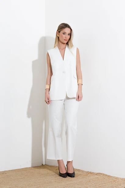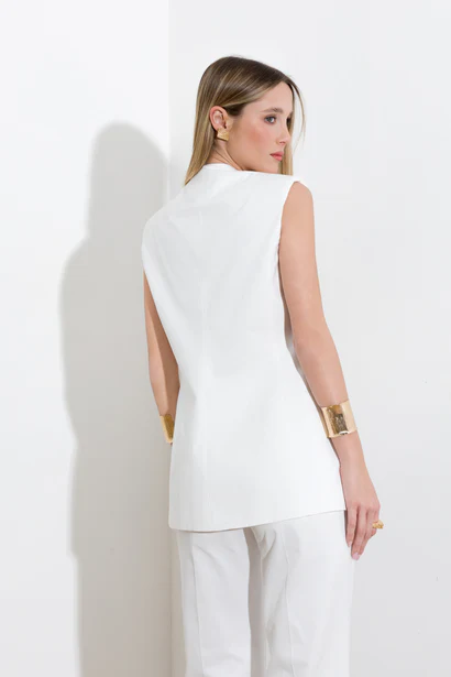 Sleeveless cotton jacket, low closure with covered button, no lapels, welt pockets with flap, lightly padded shoulders, lined.