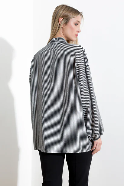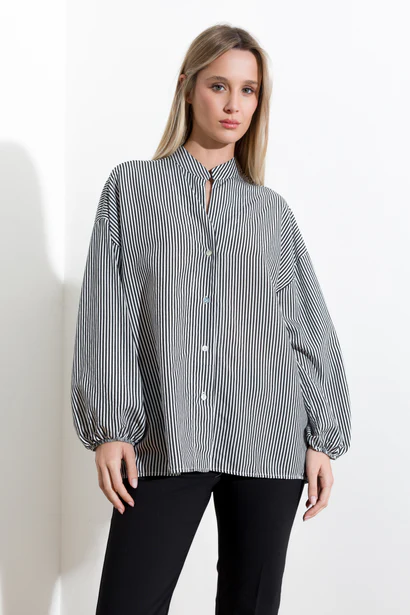Elegant viscose shirt with delicate stripes, featuring long puff sleeves that taper with elastic at the cuffs. The mandarin collar adds a sophisticated touch, while the exposed buttons complete the design with a classic yet contemporary style.