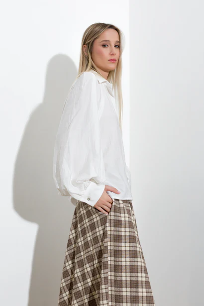 Loose-fitting, creased modal shirt with mother-of-pearl button fastening, raglan shoulder, wide sleeves with buttoned cuffs.